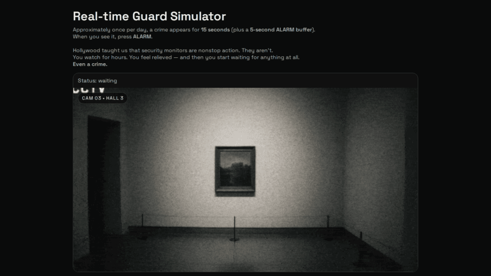 Love this curation. The Guard Simulator is genius for illustrating how boring vigilance actually is, and ElseWhere's 30-day vanishing emoji landmarks is such a nice counter to permanant social media. I've been noticing more projects lately that embrace ephemerality instead of arhciving everything forever. Feels kinda refreshing tbh.